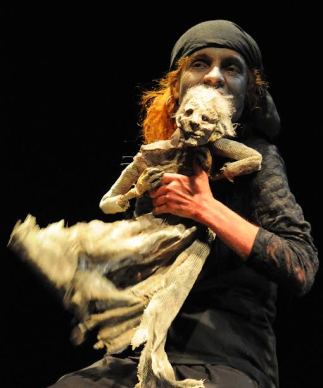 Sur les deux côtés de la scène, deux femmes, Suska Kanzler et Alexandra Lupidi. Leur visage peint de gris, petit chapeau noir sur la tête, ces musiciennes, bruiteuses, chanteuses et conteuses talentueuses vont créer une ambiance toute particulière. Ilka Schönbein, surélevé, au milieu de scène tout de noir vêtue et grimée, va donner vie à ces marionnettes. Homme, femme ou animal chacun va affronter à sa façon les affres du temps et de la mort. La faucheuse n’est jamais très loin même si parfois elle reste silencieuse. Une dualité physique se met en place entre deux corps vivants, deux êtres particuliers. Avec subtilité, elle modifie l’intonation de sa voix et l’expression de son visage. La magie opère de suite, nous voyons deux personnages. En un clin d’œil, elle se transforme et donne vie à une nouvelle histoire.