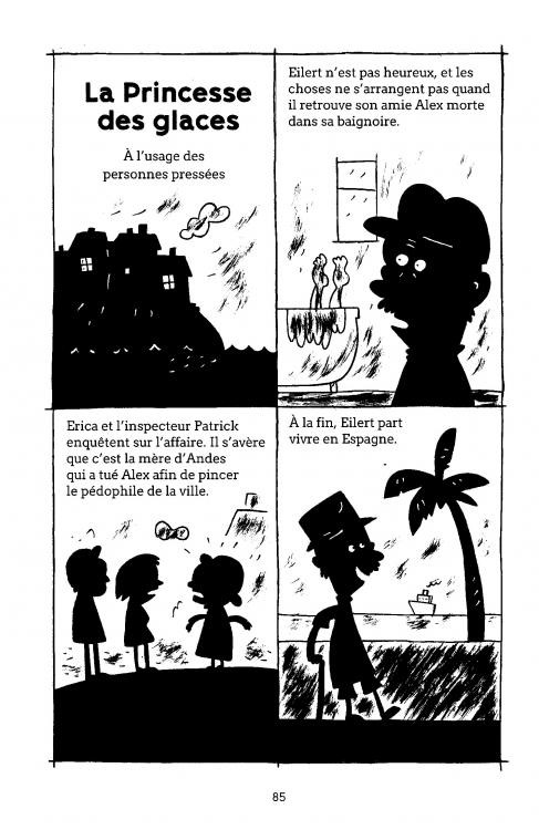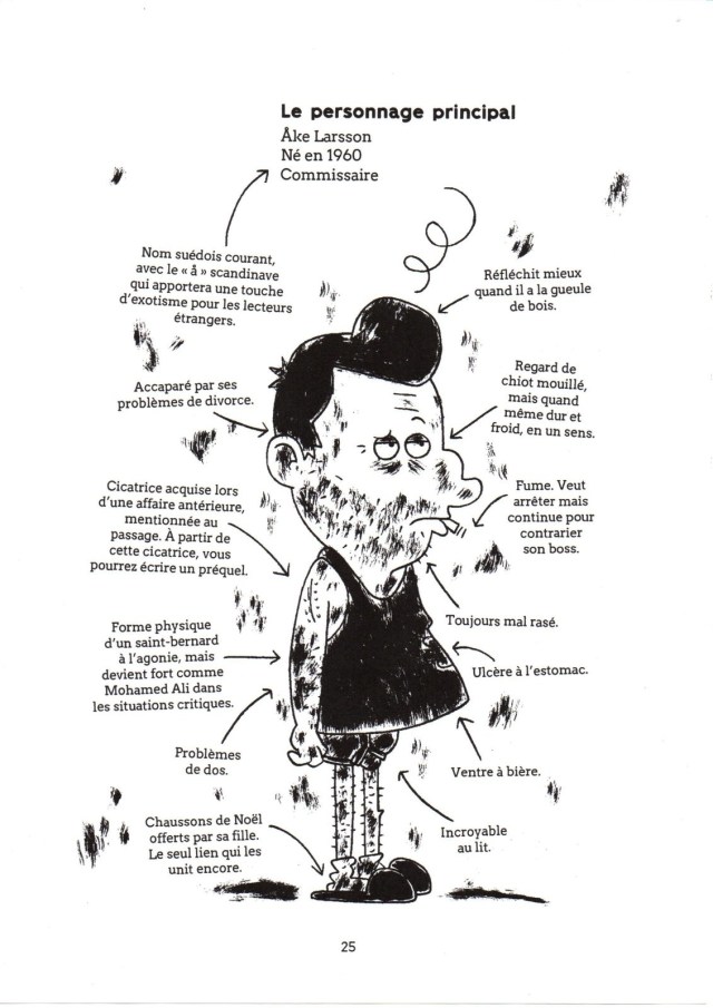 Aussi surprenant que cela puisse paraître, l’histoire suit fidèlement la bande dessinée, jusqu’à l’insertion de très courts résumés de romans suédois à succès. Tous les ingrédients pour l’écriture prennent vie sous nos yeux étonnés. Le nom d’une ville pas très connu ce qui permettra peut-être d’avoir une remise de prix par des élus locaux. Henrik Lange a choisi de parler de la ville où il vit : Bollebyg. Cela cache peut-être un espoir caché d’une récompense ? Pour nous français, cela nous paraît tout de suite exotique. De même pour le nom du héros, le commissaire se nomme Ake Larsson. Il faut qu’il possède certains caractères physique comme bedonnant, alcoolique, fumeur… Le comportement du comédien ressemble à Colombo toutefois en comparant avec la bd, Rémi Johnsen est assez semblable à son original papier.