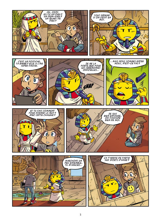 L’aventure de la saga Smiley débute en 1971. Le journaliste Franklin Loufrani qui pour lutter contre la morosité ambiante lance dans France-Soir une opération « Prenez le temps de sourire ». L’idée est de valoriser les bonnes nouvelles grâce à un pictogramme assez simple avec un visage rond et un sourire. Le journaliste dépose sa propre version du logo crée par le graphiste américain, Harvey Ball en 1963. Son fils, Nicolas Loufrani, lance en 1997 une entreprise en exploitant le smiley à toutes les sauces. Alors pour toucher tous les publics, cette année il lance une bande dessinée dans le monde de ces têtes jaunes préférées. La couverture avec les deux héros entourés de smileys chevalier, ninja, homme des cavernes, super-heroïne, policières… promet des rencontres en tout genre. Et dès la première page, le pari est tenu car nous sommes plongés au cœur de l’Egypte chez un pharaon. L’histoire se tient d’un bout à l’autre de l’album avec du savoir, de l’aventure et du suspens. La fin du tome nous ouvre sur une suite dont les adolescents vont attendre la suite avec impatience. L’univers graphique avec tous ces personnages jaunes attirent l’œil d’autant plus qu’ils sont facilement identifiable. De plus, ils font références à des choses qui peuvent intéresser le cœur de cible comme le skateboard, les samouraïs ou l’usage du numérique. Les couleurs sont vives et attirent l’œil. Les pages se tournent assez vite avec une pointe de curiosité.