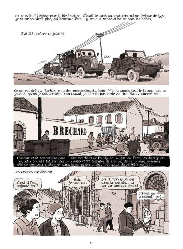 Le 6 avril 1944, Francine et sa sœur sont arrêtées par la Gestapo à Pouilly-sous-Charlieu. On va longuement les interroger. Ni l’une, ni l’autre ne va dénoncer quelqu’un du réseau. Avec de nombreuses autres femmes, elles seront parquées dans un train tel des bêtes que l’on emmène à l’abattoir. L’idée n’est pas d’ailleurs totalement fausse puisque tout le monde va être emmené au camp de Ravensbrück. Dans la nuit froide, sur le quai des soldats avec des chiens-loups les attendaient de pied ferme. Pas le temps de réfléchir, il faut suivre les ordres. Toutes celles qui vont lentement ou pas assez vite se prennent des coups. Après il faut se mettre nu devant des allemands avant qu’on leur donne des vêtements à rayure. Elle devra porter maintenant un triangle rouge. Ce n’est que le début des humiliations, des souffrances et du travail forcé qui vont s’éterniser. La vie ne tient qu’à un fil surtout face à l’inhumanité du quotidien. La solidarité entre françaises permettait de tenir. Et parfois des actes de bienveillance comme ces deux hommes qui l’ont aidé sans contrepartie. Elle est en persuadée, elle n’aurait pu survivre sans ce pull mité et ces quelques morceaux de nourritures supplémentaires. L’arrivée de la Croix Blanche suédoise était incroyable. Le calvaire allait prendre fin. Le retour en France à 23 ans, 33 kilos, a pris quelques mois mais quel bonheur de revenir chez soi. Enfin, un nouveau départ va s’ouvrir à elle même si elle ne pourra jamais avoir d’enfant.