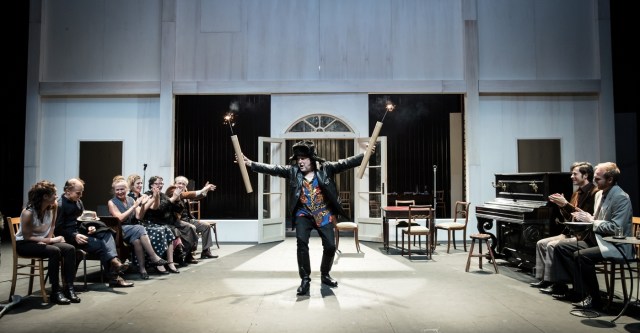 L’auteur présente la pièce comme étant une comédie. D’ailleurs cela se remarque par le rythme rapide de diction précise des comédiens, permettant des collisions en contre point du rire. « On joue à la vitesse où l’on pense » précisera le metteur en scène. Tchekhov s’est inspiré des textes de Gogol qui s’est lui-même inspiré des vaudevilles français. Mais ne vous attendez tout de même pas à des portes qui claques et des amants cachés sous la table. Christian Benedetti respecte toutes les précisions écrites comme ces pauses dans les échanges. Tchekhov incite ainsi le spectateur à réfléchir à ce qui est dit. Même si c’est un peu déroutant au début, on comprend cette démarche très adroite au finale. Il joue avec malice avec le temps réel et le temps dramaturgique. Un temps qui a un sens tout particulier puisque juste Ivanov vit le moment présent. Les autres évoquent le passé ou le futur car le présent leur est insurmontable. Et cela se trouve souligner par la mise en scène et la scénographie dans un décor intemporel à géométrie variable, judicieusement manipulé par les comédiens sur scène. Ces 13 artistes qui jouent à la perfection et donne vie à tous ces personnages avec les nuances adéquates. Un magnifique travail d’équipe qui arrive à captiver les spectateurs pendant presque 2h00. Un grand bravo pour cette performance.