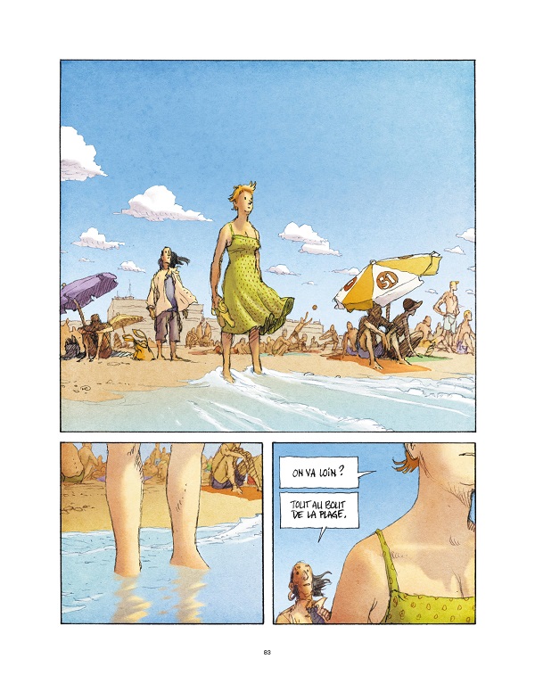 Seule parmi les vacanciers souriants, heureux, bronzés, elle suit étape par étape tout ce que Rolland avait prévu. Elle se laisse porter par les évènements et même les rencontres. L’étrange Paco, fasciné par les meurtres étranges tient une boutique de produits asiatiques et urine dans une bouteille en verre. Ils vont partager quelques moments de convivialité comme un repas pré-payé avec vue sur la mer. C’était un homme très organisé ce Rolland. Fabienne est impassible. La vie continue autour d’elle. Les plans centrés sur le visage du personnage principal ou des scènes quotidiennes apportent une douceur incroyable à cette tragique histoire. Les teintes chaleureuses contribuent à apporter un côté solaire, une chaleur incroyable. En tournant les pages, un sentiment d’empathie se développe pour Fabienne. On l’accompagne dans son deuil. Il va falloir prendre un nouveau départ alors faisons le plein visuel de bonheur simple et authentique.