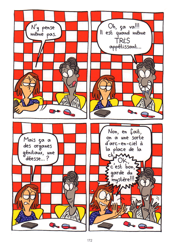 On reconnait au trait du dessin vif et l’aplat de couleur le style du dessin de presse. Normal puisque Louison publie dans Le Parisien Magazine, Marianne ou Grazia où elle croque le monde qui l’entoure. Après un carnet de croquis, un album autour de deux ans de mandat de François Hollande, Louison revient avec une bande dessinée pour les nanas. Une histoire classique avec une séparation après 5 ans de vie commune. Une séparation qui fait mal et qui demande beaucoup de volonté à remonter la pente d’où l’utilisation ingénieuse d’une déesse imaginaire. La solution à ces problèmes se trouve en général en soi. Une quête intérieure amenée avec beaucoup de philosophie et d’humour. Notre demoiselle ne renonce jamais à boire quitte à vomir et avoir la gueule de bois. Elle se sent à l’aise dans son corps, d’ailleurs un de ces seins se retrouve souvent à l’air. Ils sont un peu claustrophobe alors toute occasion est bonne pour se faufiler. Une femme assez moderne qui écoute son corps, qui apprécie faire la fête et râler quand il faut. Aucun doute que bien de nombreuses lectrices vont se reconnaître dans ce portrait.