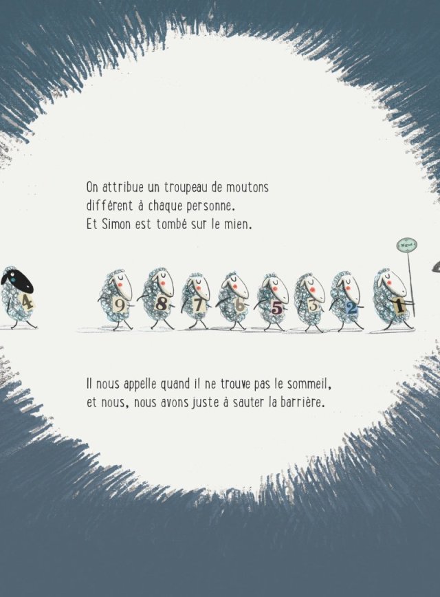 Quelle jolie histoire pour les enfants qui peinent à s’endormir. J’ai adoré cette idée que les moutons portent des numéros et qu’ils doivent sauter les uns après les autres au-dessus d’un obstacle dans l’ordre. Un mouton rebelle refuse de faire son boulot. Les autres le poussent, l’invectivent et personne ne cherche à comprendre son geste. S’il ne joue pas le jeu, il y a un risque que Sacha aille compter les cochons. Une idée très originale de Margarita del Mazo pleine d’imagination. Et quelle fin pleine de douceur avec ce mouton rebelle qui dort au creux du coup de l’enfant. On ne pouvait pas rêver mieux qu’un happy end pour faire plaisir aux plus jeunes. Il faut dire que le graphisme de Guridi aide grandement à me faire sourire. J’ai eu le coup de cœur en voyant la couverture avec ce mouton pas content. Les teintes des pages varient selon les personnages : très sombre pour l’enfant car nous sommes dans sa chambre la nuit et fond blanc, tracé noir et herbe verte pour le monde des moutons. Les deux se complètent très bien et ainsi le jeune lecteur peut tout comprendre.