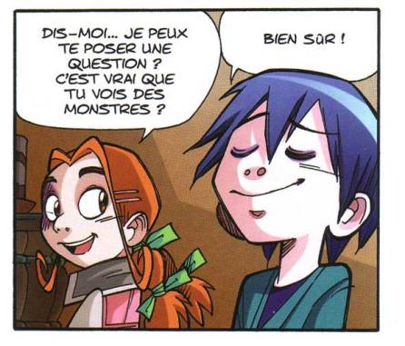 J’avais lu ce tome il y a fort longtemps et j’en avais gardé un bon souvenir. Et quand je me replongée dans la bd avec un peu d’appréhension, j’ai été ravie de retrouver ce plaisir de lecture. L’histoire mélange avec justesse amitié, magie, monstre et monde réel. Un ensemble qui peut surprendre mais dosé avec harmonie cela donne un récit d’aventure passionnant. Le premier tome présente les personnages principaux et la particularité de l’univers. Le graphisme et la couleur supervisés par Alessandro Barbucci et Barbara Canepa (série Sky-Doll) sont comme à leur habitude parfait dans la réalisation avec des nuances de teintes assez poussées. On passe très vite d’un espace chaleureux avec du orange, du jaune à des espace plus mystérieux avec du gris et marron et et des couleurs spécifique pour Zick avec le bleu, vert et mauve. L’humour est bien entendu présent. J’ai éclaté de rire quand le chat de Zick met une claque à Frou-Frou. Situation drôle avec un dessin de la tête du chat qui ne s’attendait pas à cela. Quatre cases qui m’ont fait éclater de rire. J’ai dévoré le tome qui m’a donné très envie de relire toute la série. C’est avec hâte que je veux retrouver les monstres de toutes formes, de toutes tailles qui se cachent dans Bigburg. L’année va bien commencer en bande dessinée.