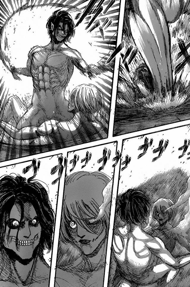 Malgré quelques morts, le titan féminin a été attrapé et bien maintenu. Impossible pour elle de s’échapper. Il faut l’ouvrir pour savoir qui se cache à l’intérieur. Mais ce spécimen très spécial arrive à durcir cette zone sensible du cou. Pas le choix, il va falloir utiliser des explosifs. Cette perspective n’enchante pas le monstre. C’est alors qu’elle émet un gris d’animal blessé à la plus grande surprise de tous les soldats. Un phénomène improbable arrive : une armée de titans accourent dans la forêt et se jette sur le titan féminin. Il le dévore morceau par morceau ainsi plus moyen de l’identifier. Mais ce comportement soulève une question : comment la personne à l’intérieur a-t-elle pu s’enfuir ? Une seule possibilité : c’est l’une des leurs et elle possède leur matériel. Et elle a un objectif : capturer Eren. Mais que veut-elle lui faire ? Quand elle est arrivée à l’absorber, elle l’a gardé en vie. Pourquoi ? Avant de pouvoir en savoir plus, il faut rentrer à la base en situation d’échec. Toutefois avec une certitude, quelqu’un de l’intérieur veut mettre fin à l’humanité. Il va falloir identité les coupables et leur motivation.
