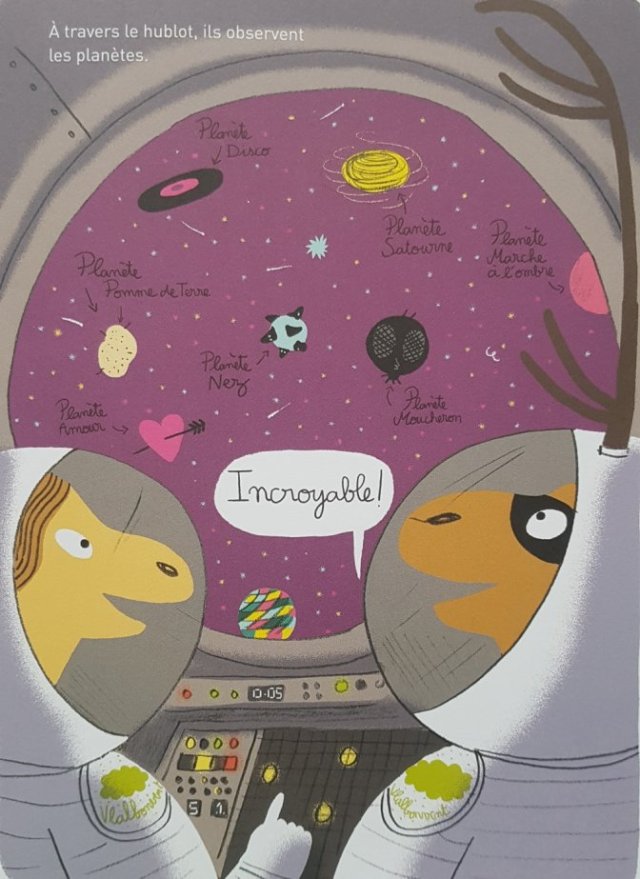 Un caribou super héros qui peut voler avec une tenue assez kitch, c’est assez vendeur. Jean-Miche pour les intimes, portent un body à manche longue bleu ciel avec des points blancs, une cape rouge, un masque noir et des raquettes aux pieds. Si cela sait séduire l’adulte que je suis, cela ne peut que ravir les enfants. Ne chercher pas à savoir s’il rajoute un slip sous son juste au corps. Peut-être cela fera office d’un prochain tome. Jean-Michel a des supers-pouvoirs et veut les utiliser pour le bien de la population. C’est beau. C’est mignon tout plein. En plus, il voyage dans un vaisseau spatial assorti à sa tenue. Il faut savoir être raccord dans la vie. Magali Le Huche ne va certes pas me contredire. La créatrice de cet univers coloré à de la suite dans les idées et une imagination débordante. Sur la planète Pomme de terre on rencontre des frites qui adore le ketchup et sur la planète Satourne, des navets qui tournent à toute vitesse. Une vision de l’espace qui devrait prêter à sourire Hubert Reeves. Tout est adorable dans cet album jeunesse. On trouve même un personnage sourd qui doit lire sur les lèvres et qui répond en langue des signes. C’est assez rare pour être souligné et applaudir cette initiative qui j’espère se retrouve dans d’autres tomes. Pour finir, je voulais parler du bel objet livre, avec une couverture cartonné, des couleurs chaleureuses et les bords arrondis. Un livre que l’on prend plaisir à ranger dans sa bibliothèque.