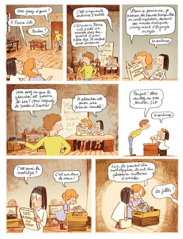 L’imaginaire de Catherine Meurisse a pris naissance dans ce jardin merveilleux qui recèle de nombreux mystères. Grâce à cela elle est devenue une conteuse hors pair avec un coup de crayon qui semble intemporel. Son histoire trouve le juste équilibre entre les faits factuels et le monde de l’imaginaire. J’ai autant apprécié ces échanges passionnés avec sa mère qui parle des fleurs du jardin que des étonnants échanges avec le nain de jardin. On voit la curiosité de la petite fille qui ne l’a jamais quitté avec son musée des trésors à l’image de Pierre Loti ou la découverte des artistes au musée du Louvre. Au fil des pages, je m’émerveille comme l’enfant qui s’ouvre au monde. Les fleurs prennent vie comme les champignons. Mais elle n’oublie pas de faire passer un message écologique comme le fait qu’on coupe les arbres dans les champs ou que l’on utilise de grosses quantités de pesticides. N’ayez crainte, jamais le ton n’est moraliste. Bien au contraire, légèreté et humour sont de mise à chaque page et ce jusqu’à la dernière page où la petite fille devient une belle femme courageuse inventive.
