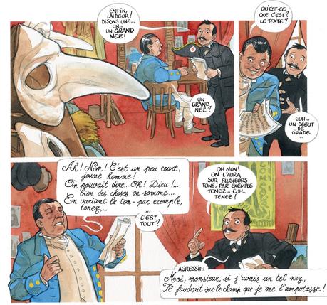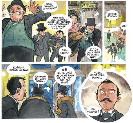 L’esprit de la pièce est assez bien restitué dans la bd. L’exercice est pourtant difficile. Le rythme de la pièce se trouve très dense avec les nombreux changements de décors et de personnages. Tout doit se faire devant le spectateur. La bd permet des transitions plus facile et sans précipitation. Même si la pression est mise sur Edmond, on reste tranquille à tourner les pages, on ne stress pas pour lui. L’engouement à la suivre se fait moins ressentir. Mais difficile encore une fois de retrouver les même impressions entre un spectacle vivant et des êtres d’encre et de couleurs. L’univers est différent ce qui n’empêche pas d’apprécier l’histoire et de s’attacher à l’ensemble des personnages comme Honoré le cafetiers ou Coquelin, un passionné. Certains reprochent la trop grande présence des financiers corses cependant, c’est très proche de la pièce. Il n’y a pas d’exagération. Pour la couleur et la mise en page, Léonard Chemineau a fait un intelligent mixage entre un style un peu classique en nuançant avec une structuration assez dynamique. Déjà, on ne trouve pas de bordure de case noire et les cases ne sont pas forcément rondes. Les couleurs s’affichent dans leur complémentarité. Pas d’aplat. Ici on ne cache rien puisqu’on raconte l’histoire d’une création où l’on montre tout. Un choix pertinent et cohérent avec l’histoire.