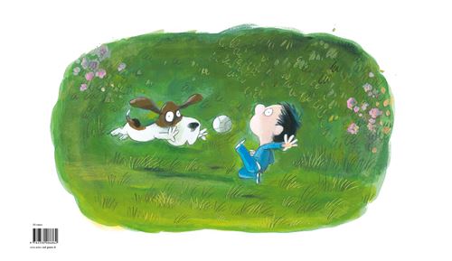 Alors se lancer dans la lecture « J’en rêvais depuis longtemps » est un plaisir avant même d’ouvrir le livre. Déjà, le support livre est très grand et la couverture est magnifique avec cette dominance de vert qui rappelle un autre livre « Louis Ier, le roi des moutons ». On s’interroge avec ce garçon et le chien sur deux pattes cachés derrière un pan de mur chacun. Jouent-ils à cache-cache ? se cherchent-ils ? est-ce en lien avec le ballon devant eux ? La réponse se trouve en quatrième de couverture.