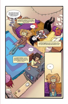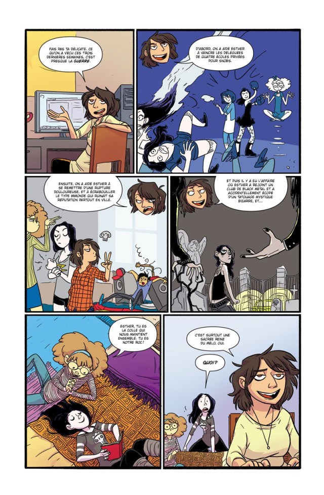 En 2011, John Allison imagine cette série pleine d’humour. Son atout charme repose sur le fait qu’il parle d’une bande de filles à l’université. Pas de filles prépubéres, pas de filles qui se passionnent pour la danse et pas de filles qui ont des supers-pouvoirs. Enfin des filles presque adultes qui ont des vies qui peuvent ressembler à des vraies personnes et on parle de leur lien d’amitié. Après on peut se poser la question, est-ce que sociologiquement, des filles si différentes pourraient devenir amies ? Je penserais que non mais enfermées dans une petite surface pourquoi pas. Une résidence universitaire, c’est un peu ça quand même. L’autre plus, c’est que le tome n’est pas consacrée à la présentation des trois protagonistes principales, l’école, les cours, les garçons… La première page présente nos Esther, Susan et Daisy et hop on saute directement dans une histoire. De façon, on apprendra à les connaître au fur et à mesure que les ennuis vont se présenter. Entre les pervers, la grappe et l’amoureux secret, pas le temps de s’ennuyer. J’ai fini par croire que je partageais un moment avec des copines un peu loufoques mais au combien géniales. Alors quand je suis arrivée à la dernière pas, je me suis dit que ce n’était pas possible. Notre amitié ne pouvait pas déjà parvenir à son terme. Pas le choix, il va falloir que je me procure assez vite la suite à la médiathèque. J’ai hâte de les retrouver.