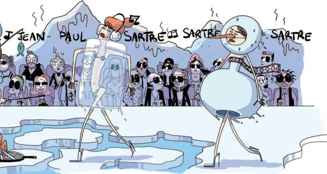 Camille Monge a travaillé dans le monde de la mode ce qui lui a permis de trouver une source inépuisable d’histoires à raconter. Un univers assez difficile où chacun lutte pour sa survie au mépris des autres. De terrible requins qui n’hésitent à pas s’entredévorer. Pas d’exception chez les grands de la mode qui sont évoqués ici comme Anna Wintour ou Karl Lagarfeld. La folie d’un investisseur pousse vers du grand n’importe quoi. Mais n’est-pas un milieu où l’argent et l’image sont les deux choses les plus importantes? Alors rien de mieux pour raconter des histoires drôles et absurdes. Comme ce Berlingo qui ne parle qu’anglais et qui veut absolument créer une ligne autour des icebergs. Absurde à souhait. Le seul reproche que l’on peut faire concerne le personne de Berlingo qui parle en anglais. Même si c’est assez rudimentaire, cela risque de déplaire à des lecteurs. Le dessin de Stella Lory ressemble aux caricatures de Jul, connu pour sa série « Silex and the city ». Tous les traits sont ponctuels, marqués de noir avec des couleurs chaudes en aplat. Le monde de la mode est très bien retraduit avec ces mannequins fil de fer et un milieu très concurrentiel.
