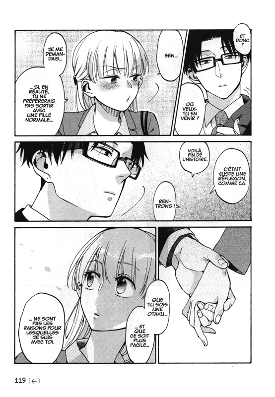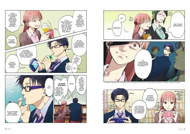Je m’attendais une histoire complète et structurée pour suivre l’évolution dans la personnalité des personnages, de leur attente, de leur peur… Mais non, Fujita a préféré faire une succession de saynètes assez brèves où l’on voit Narumi et Hirotaka et leurs collègues Hanako et Tarô qui vivent un amour haine. Les deux couples sont à l’opposé, l’un ne parle et échange peu et l’autre parle beaucoup et se dispute presque tout le temps. Les deux geeks essaient de se rapprocher mais il manque une étincelle. Au final, je m’ennuie car il ne se passe vraiment pas grand chose. On trouve des touches d’humour, des références à l’univers des otakus mais cela ne suffit pas. Je ne m’attache pas aux personnages qui sont assez clichés.