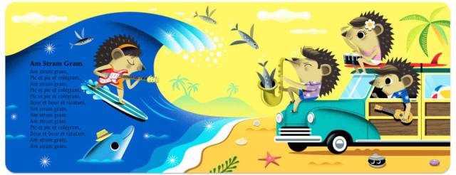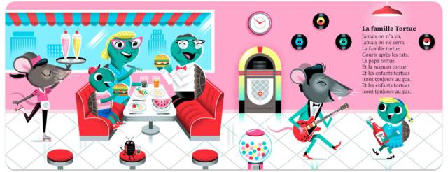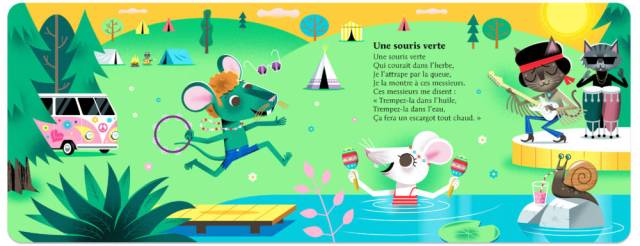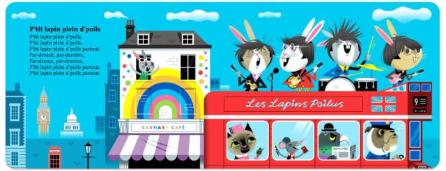 Les enfants apprécient les livres musicaux surtout quand ils peuvent appuyer sur des gros boutons qui font de la musique. Ce petit livre aux pages épaisses et très colorés propose de découvrir 7 petites comptines très rock. Chacune porte un nom écrit en haut de page comme « La famille tortue » ou « Une souris verte ». Sur chaque double page, on trouve de très jolies dessins pleins d’énergie, de bonne humeur et d’humour. Comment ne pas sourire à la référence des Beatles sur un bus anglais?