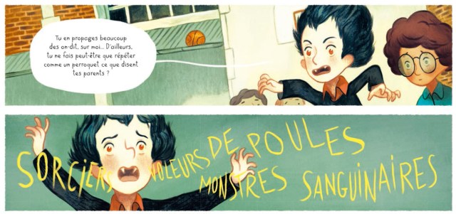 Loïc Clément a décidé de choisir un sujet fort pour sa création bd jeunesse. Le harcèlement scolaire assez peu évoqué en littérature et encore en moins dans le 9ème art. Le sujet est très bien amené via un personnage fantastique : Dracula qui à l’image d’être fort et sans ennemi. Mais avant d’en arriver là, il a du prendre confiance en lui. Le cheminement du harcèlement est bien expliqué avec la variété des agressions possible. L’enfant décide de garder le silence et intériorise son mal-être. Il tente d’en parler à son père qui fait une réponse basique. Souvent les parents ne prennent pas en compte l’horreur que cela peut-être au quotidien à vivre. Quand il ouvre son coeur à un professionnel la parole donne des mots aux blessures. C’est ainsi que les problèmes peuvent être résolus. En effet, les tortionnaires seraient des enfants malheureux mais cela ne résout pas le problème de comportement. Grâce à la parole l’enfant va pouvoir aller mieux et les agressions vont s’arrêter. Il est dommage qu’à la fin de l’ouvrage ne soit pas communiquer des numéros verts adressés aux enfants afin de pouvoir parler de leur problème.