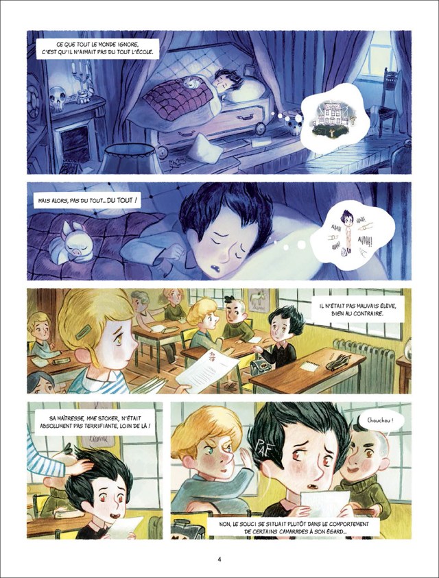 Le sublime graphisme de Clément Lefèvre avec des couleurs pastels rend la lecture très agréable. On s’attache au petit Dracula qui semble si fragile. L’univers des vampires est fabuleux avec le chat mort-vivant dont on ne voit que les os et la servante fantôme dans la maison familiale. La variation dans la taille des cases donne une vrai dynamique dans l’histoire. Un vrai régal pour les yeux de tourner les pages. Cela apporte du réconfort à lecture au vue du sujet assez sensible abordé. Les teintes rassurent sur l’histoire et permet de mieux s’identifier au personnage principal. J’applaudis la référence discrète à Mme Stocker, maîtresse de Dracula qui va tomber amoureuse de son père. Bram Stocker devrait ravie que son roman est fait tant d’émule.
