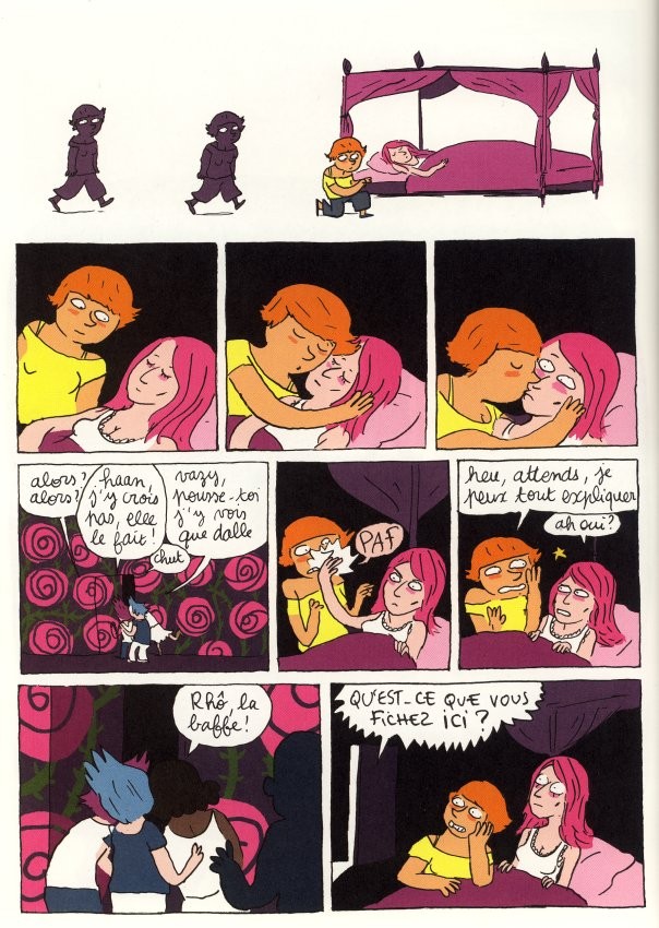 Lisa Mandel est une artiste de talent qui a de l’imagination à revendre. Et malgré, le titre, il ne faut pas s’attendre à une simple histoire d’amour lesbienne. Cela sera beaucoup trop simple. La reine de la frite se nomme Végétaline de Brillance, un prénom et nom pas du tout choisi au hasard. Les petites touches d’humour sont éparpillées un peu partout. Il faut bien installer un contexte assez loufoque et absurde pour entraîner le lecteur dans son délire de preuse chevalière sauvant son amoureuse. Il y a une autre intrigue loufoque dans l’histoire avec le fait qu’il retrouver un téléphone vidéo 3D que Kekuo a volé à son père, un ingénieux ingénieur. Le téléphone se trouve dans la tour de la terrible mère de Végétaline. Codette va aider les chercheurs à pénétrer dans l’immeuble, récupérer l’objet et fuir avec sa chérie. Pour cela, rien de tel que des tenus d’invisibilité, qui peuvent même passer au travers des matières. Les costumes sont du très haut niveau par rapport à leur aspect : référence à Bioman. Mais la cerise du gâteau n’est pas dans le vol et la course poursuite avec la sécurité. Ben, non on peut encore aller plus loin dans l’improbable. Lisa Mandel ne nous laisse jamais sur notre faim. Le dénouement est du très niveau d’étrangeté et d’étonnement. Vous n’auriez pas pensé à tout ce que Lisa Mandel pense. Elle ne se refuse rien et c’est ça qui fait son charme. Avec son dessin assez fin et imprécis, elle arrive toujours à nous happer dans une histoire impossible. Au début, on est dubitatif et après on devient accro. On veut tout lire Lisa Mandel qui ose la différence avec audace et humour.