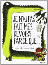 Pas de chance pour lui, sa maîtresse veux le devoir qu’elle a demandé. Mais il n’a rien fait. Face à la question de l’enseignante : « Dis-moi, pourquoi n’as-tu pas fait tes devoirs? » il a un petit moment d’hésitation. Puis très vite, il lui cite de nombreuses propositions plus farfelues les unes que les autres : un robot a détruit sa maison, des elfes ont caché ses crayons, son chat est mort…. L’air dubitative de la maîtresse lui font dire : « Pourquoi ne me croyez-vous pas? » Elle pourrait répondre bien des choses face aux histoires abracadabrantesques de l’enfant. A la place, elle lui sort un livre qui lui prouve sa mauvaise fois. Pour la peine, il a gagné une punition. Il doit recopier encore et encore : « Les lézards géants n’ont jamais envahi mon quartier. »