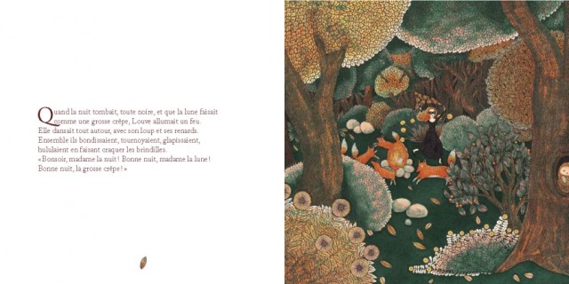 Fanny Ducassé possède un univers bien a elle où les frontières de l’imagination n’existent pas. Alors il faut se laisser se porter par son âme d’enfant pour suivre Louve dans sa foret. Une femme à la crinière flamboyante qui découvre l’amour avec un homme-loup, quel jolie message de tolérance. L’amour ne connaît pas logique il faut se laisser porter par son coeur. En plus, il est impossible ne pas s’émerveiller à défaut du texte du graphisme plein de douceur et de poésie. Un monde végétal fourmille de mille éclats, couleur d’automne avec des détails partout. Un régal à chaque page. Il faut prendre le temps de tout regarder et se laisse submerger. Les yeux apprécie cette aventure onirique. Et quant on referme l’album, un plaisir simple nous submerge d’avoir passer un bon moment de lecture.