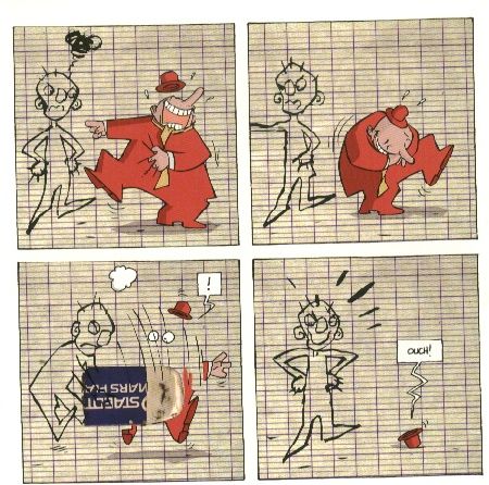 Olivier Ka et Alfred ont crée un personnage. Un homme habillé de rouge, très dynamique qui a toujours des idées loufoques. Sur une double page, en huit cases une aventure lui arrive et sans jamais prononcé un seul mot. Un travail de précision qui demande beaucoup de réflexion à ces des créateurs. Ainsi la bande dessinée peut être aussi bien lue et appréciée par un enfant ou un adulte.