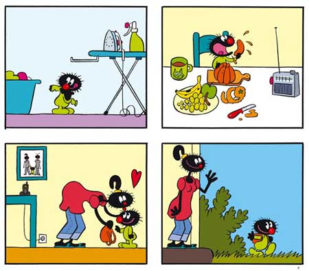 Petit Poilu de Pierre Bailly et Céline Fraipont est une bande dessinée sans texte a destination des enfants à partir de 3 ans. L’histoire est très simple, facilement compréhensible. En plus, visuellement, l’univers est très accessible sans beaucoup de détail et de nuance dans les couleurs. Ainsi le primo-lecteur n’a pas trop d’information à enregistrer et peut se concentrer aisément que sur l’histoire. Une très jolie construction avec du rythme, des rebondissements et de l’humour. Une première lecture qui ne peut que piquer la curiosité des plus jeunes. Car cette bande dessinée les considère capable de comprendre avec un véritable récit et les incite à lire tout seul comme des grands.