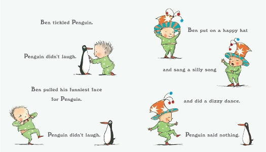 Le coup de crayon de Polly Dunbar n’est pas sans rappeler de vieux albums anglais. Et cela est bien normal car l’auteure illustratrice vient du pays du Docteur Who. Un style assez particulier, aérien, simple et efficace. Des pointes de couleurs pour les personnages avec un fond blanc permettant de valoriser l’histoire. Rien autour ne peut attirer l’attention. Les enfants peuvent s’attacher au petit Ben auquel ils pourront s’identifier. On lui offre un jouet qui ne lui répond pas alors il tente par tous les moyens que celui-ci interagisse avec lui. Tout un panel de stratagème se montre que les enfants et les parents vont reconnaître de suite. Puis l’imaginaire prend le dessus car la peluche en forme de Pingouin prend vie et affronte un lion. Quelle autre témoignage d’affection pourrait-on rêver de mieux?