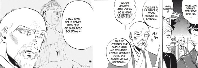 Une couronne d’épine assez particulière car se sont les archanges qui lui ont demandé de la porter. Non afin que son identité soit visible aux yeux de tous mais elle possède un signal GPS inclus et une alarme contre les agressions.Dans la banlieue tokyoïte, il faut dire que c’est Bouddha qui est plus facilement reconnaissable. Surtout quand il est mécontent et qu’il se met à briller. La discrétion n’est pas facile. Ils font de leur mieux et dans la bonne humeur. Souvent, ils essaient de former un duo comique. Parfois, ils arrivent même à faire rire d’autres personnes que leurs amis comme Saint Michel ou Ananda. Jésus ose parfois des blagues assez surprenantes comme « Ceci est mon Knorr » en proposant une soupe à Bouddha. Ou encore, lorsqu’ensemble, ils vont dans un bain public, Jésus change l’eau en vin. Sa réflexion « avec circoncis des cheveux » lui a procuré du bien-être et donc miracle. Un résultat étonnant qui va rapprocher les deux amis. Des blagues assez simples en apparence qui sont très efficaces au vue des auras des personnages. Et trouver le juste milieu sans froisser les croyants est une prouesse à souligner. D’autant plus qu’il y a des références historiques comme celle aux jésuites. Ils ont fait du prosélytisme, alors interdit. Cependant ils possédaient des connaissances techniques qu’ils ont su mettre en valeur et leur sauver la vie.