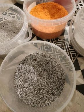 Déposer le sable coloré, jusqu’à trois couleurs différentes. Mettre le sable le plus fin pour aller jusqu’au plus épais entre 1 à 2,5 cm.
