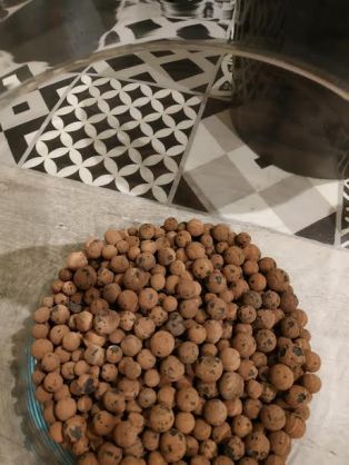 Faire un mélange entre la terre de composte et la terre de bruyère qui contient de la perlite (roche naturelle volcanique qui retient jusqu’à trois fois son poids). Déposer doucement la terre sur les billes d’argile en évitant de les mélanger. Il faut mettre environ 1/3 de la quantité de billes.