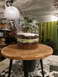Avant de commencer l’atelier, quelques conseils de base au niveau des plantes. Il est décommandé de mettre de la mousse en décoration du terrarium. Cette matière vivante demande de l’entretien et ne peut être arrosé avec de l’eau du robinet. Par conséquent, nous n’en mettrons pas dans notre création. Pour l’assemblage des plantes, il faut en mettre qui sont de la même famille pour prendre soin d’elles.