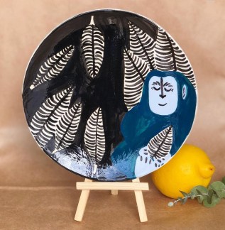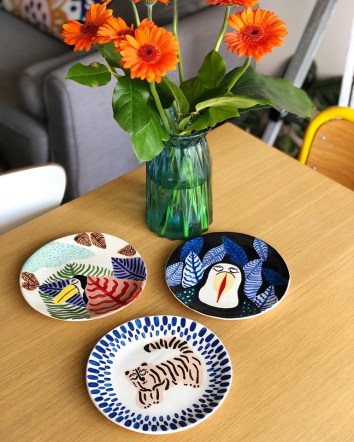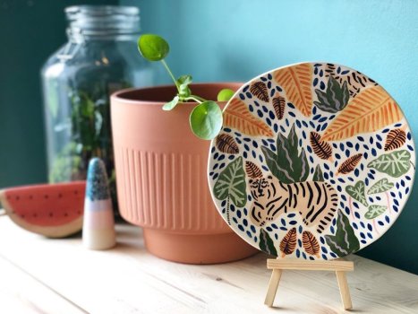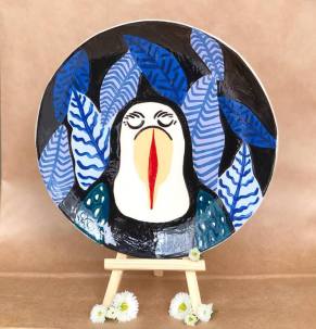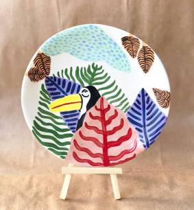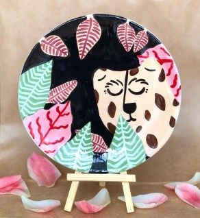 Une charmante jeune femme, souriante, nous présente son travail et son parcours. Sur la table on peut voir quelques unes de ces assiettes peintes où l’on peut rencontrer des léopard, tigre, toucan et singe.