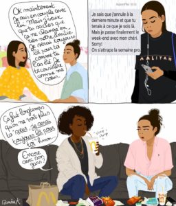 « L’univers est infini, stupéfiant, miraculeux, insondable, titanesque, vaste, curieux, perpétuel, remarquable, insensé. Notre refuge ». Une façon pleine de délicatesse de commencer une histoire d’amour. Une rencontre, un coup de coeur qui devient de l’amour saison après saison. On rit des même choses. On a envie de les partager à deux. On se dit « Je t’aime ». Puis vint le jour, où il faut passer à l’étape d’après, la présentation à la famille. Puis Sanäa reçoit un appel d’Ismaël « J’ai hâte de rencontrer tes parents et que tu rencontres les miens, mais… euh… finalement je ne pourrai pas. J’ai beaucoup de travail à finir. Ce n’est que partie remise. » Mais voilà, cela est la dernière fois qu’elle entend sa voix. Une façon très inélégante de faire une rupture. Elle ne s’attendait pas à une tel choc de la part de quelqu’un qu’elle aimait si fort. La voilà ravager, détruite. Pourtant, il faut faire face et avancer. Trouver un travail, payer son loyer, voir ces amis et garder le moral. L’espoir aussi de percer dans le monde de la bande dessinée mais comme faire sans faire connaître son travail? Les blessures au coeur et au moral finissent par cicatriser. Ainsi de nouveaux rêves peuvent prendre naissance et se concrétiser.
