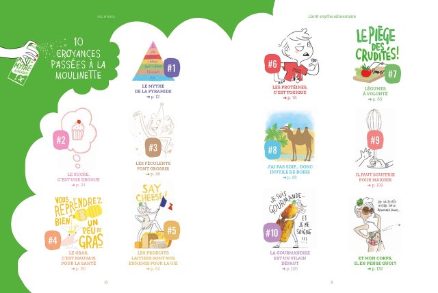 Et si vous ne me croyez pas, il suffit déjà de regarder la couverture. Le titre « L’anti-guide alimentaire » brille et vous avez une charmante femme qui dit « Garanti sans régime 100% plaisir ». Vous l’aurez compris, ici on n’est là pour rigoler et s’enrichir. Finir avec la culpabilité et dire enfin bonjour au bonheur. Les illustrations sont adorables comme cette femme les pieds sur du fromage avec un drapeau français avec le texte écrit Say cheese. Et avec un commentaire en vert fluo, car ici on est fun partout « Tu peux manger une portion de fromage tous les jours ». Puis on trouve aussi des illustrations d’aliments, de condiments, de plats pour mieux expliquer. J’ai été 100% conquise car je me suis sentie rassurer sur la nourriture. Pas besoin de s’inquiéter, quelques conseils permet de prendre confiance et d’essayer des choses avec plus de quiétude. Alors si vous voulez appréhendez le remplissage de votre réfrigérateur, mieux faire vos courses et mieux manger au restaurant, tout vous sera révéler pour vous apaisez. Reprendre de la confiance en soi et dans la nourriture, ne peut être qu’un ticket vers l’épanouissement personnelle.