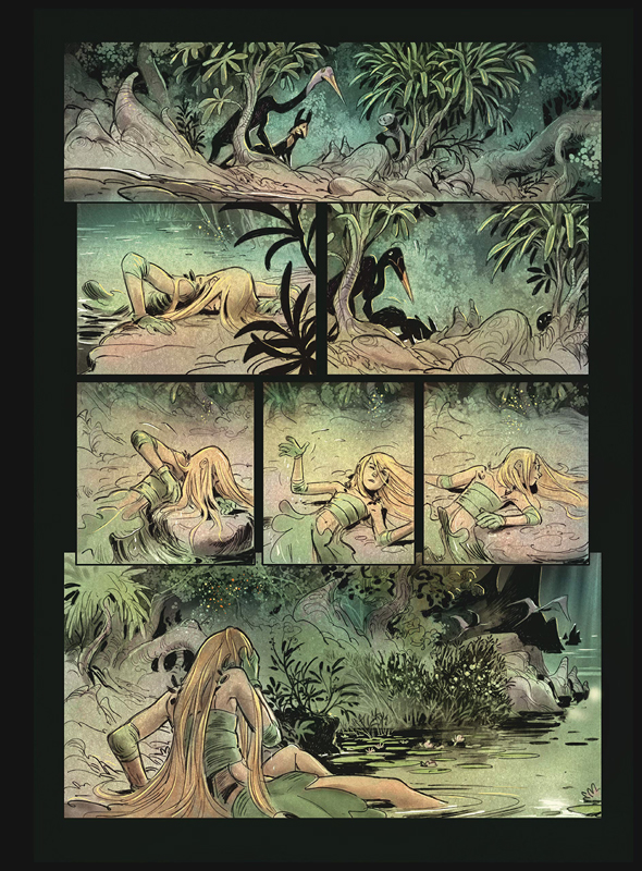 Quel ravissement pour les yeux. Le travail graphique et de mise en page de Federico Bertolucci est à couper le souffle. On voit des doubles pages avec de magnifiques paysages dans des teintes bleues/vertes. Ils occupent tout l’espace. Et dessus vient s’agréger des cases où l’histoire se raconte. Une construction astucieuse, maligne et riche visuellement. On prend son temps pour regarder les détails, les visages, les costumes… Quand une nouvelle teinte fait son apparition avec le marron orangé on sait que quelque chose de mystique se dévoile. La précision du dessin nous incite à cette gourmandise visuelle. Surtout que Brindille est une demoiselle bien jolie et gentille. On prend plaisir à la suivre dans ces pérégrinations. Naturellement, de l’empathie nous envahit quand elle doit faire des choses difficiles comme tuer une sirène pour voler sa peau.
