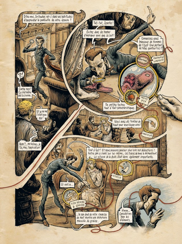 La surprise ne va pas s’arrêter là. On va suivre un fil rouge qui va de la première à la dernière page. Un lien visible et discret qui valorise le chemin de la réflexion de l’enquêteur. Vous verrez les détails importants, les références nécessaires pour résoudre une énigme de taille. D’ailleurs, vous n’aurez pas la réponse dans ce premier tome. Il faudra ménager sa curiosité pour attendre la lecture du tome 2. En attendant, vous allez prendre le temps de regarder le graphisme. Ambiance d’un autre temps avec un fond papier ancien, marron. Puis le dessin affirme sa personnalité avec des traits fins marqués noir et des couleurs assez sombres. Une certitude la structure classique n’est pas l’apanage des deux artistes. Les cases suivent le fil de la pensée de Sherlock Holme alors on voit des cases ovales, rectangulaires ou en forme de vague. Aucune limite dans la créativité. Vous allez être complètement bluffés par l’ingéniosité de la construction. C’est le lien phare dans le scénario qui permet de donner sens aux mots. Difficile d’en décrire plus. Cette lecture est quelque chose qui se vit.