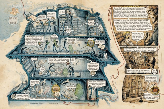 Dès qu’on a l’ouvrage en main, on constate que l’on va vivre une aventure de lecture 9ème art assez singulière. On a le titre écrit en grand : « Dans la tête de Sherlock Holmes » et une tête découpée dans le carton de la couverture. Et pas n’importe laquelle, celle d’un homme fumant une pipe avec un chapeau. D’ailleurs, ce haut de corps est à la fois une tête et une maison. Réside ici, le coeur du fonctionnement de l’homme atypique. En cas de doute, on voit la première page sur laquelle figure un homme, effilé, fier prenant un livre dans la bibliothèque du crime. Quand on ouvre la bd, on voit l’étendue des rayonnages et des thématiques : cambriolages, meurtres, vols, extorsions….