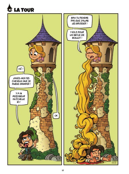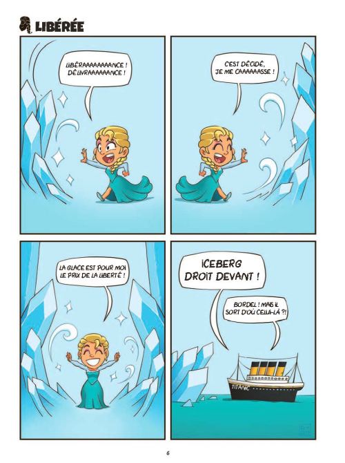 L’effet doit être efficace assez vite car le trio scénariste, dessinateur et coloriste n’ont le droit qu’à deux pages maxi pour faire rire. Pour que la compréhension soit assez efficace, Gyom ne s’embarrasse pas avec des décors chargés. Et Mista Blatte, favorise les aplats de couleurs et des teintes assez peps et sans nuance. Tout est fait pour que la blague fasse sont effet en un clin d’oeil. Pas besoin non plus d’avoir une grande culture Disney pour comprendre. L’humour noir et le sarcasme sont de mise. Attentions aux âmes sensibles, car vous n’aurez pas assez de doigt sur votre main pour compter les morts. Le sang ne va pas se faire discret non plus. C’est le côté obscur du monde merveilleux de Disney.