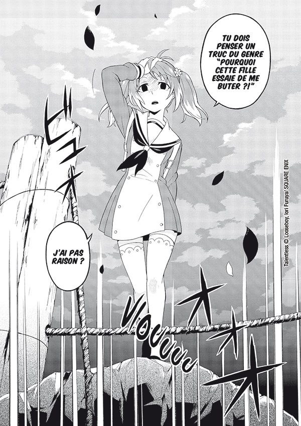 Le manga débute avec un plan d’une île vue du dessus. Puis on voit un téléphone et enfin le message qui est inscrit : « Exterminer jusqu’au dernier tous les ennemis de l’humanité qui sévissent sur l’île. Les estimations indiquent que leur élimination pourrait sauver 10 millions de vie ». On ne connait pas l’identité de celui ou celle qui reçoit cet énigmatique message et le lien entre des vies sauver et les gens à tuer. Puis on rencontre Nanao Nakajima, un élève que l’on maltraite et qui reste discret. Il tape dans l’oeil de la nouvelle arrivante Nana qui annonce son pouvoir. Elle montre une joie de vie débordante et qui attire forcément l’attention. On apprend qu’on est sur une île et que les enfants qui sont ici possèdent un don. Ils doivent être formés afin d’affronter les ennemis de l’humanité. Mais aucun cours ne leur montre comment se battre, comment développer leurs capacités… Etrange. Nana montre ses véritable attention aux lecteurs et se débarrasse discrètement de deux élèves qui deviendront peut-être des tueurs. « Yôhei Shibusawa estimation du nombre de victimes : plus de 800 000 ». Kyôya va se mettre sur son chemin car il sent que quelque chose de louche se passe. Le mystère doucement prend de l’épaisseur et un combat entre eux deux s’annonce. L’école ne fait rien, pourquoi? Sont-ils vraiment des prédateurs qu’il faut isoler de la société? Que se cache t’il derrière ce centre?