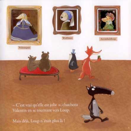 Une certitude pour Loup : « Les musées, c’est ennuyeux ». Mais quand ces amis et son amoureuse viennent frapper à sa porte pour l’emmener au musée, il ne peut refuser. Que ne ferait-il pas pour plaire à Louve? Maître Hibou débute sa visite avec son oeuvre préférée celle de Louonard de Vinci. Vous voyez de quel tableau il s’agit? Excepté que là, son visage est celui d’un animal, un loup bien entendu. Rien ne l’intéresse vraiment notre rebelle jusqu’au moment où il entend un cri : « Au voleur! Au voleur! ». Impossible de rester inactif. Quelqu’un a volé un masque tibétain. Avec l’aide du gardien, ils suivent des traces laissées au sol. Cela les mène à la rencontre du dodo, de dinosaures, un mammouth, jusqu’aux trésors de la préhistoire, des égyptiens… Que de merveilleuses découvertes pour notre jeune Loup qui ne verra plus jamais les musées du même oeil. Aucun doute que maintenant, il voudra aller plus volontiers au musée.