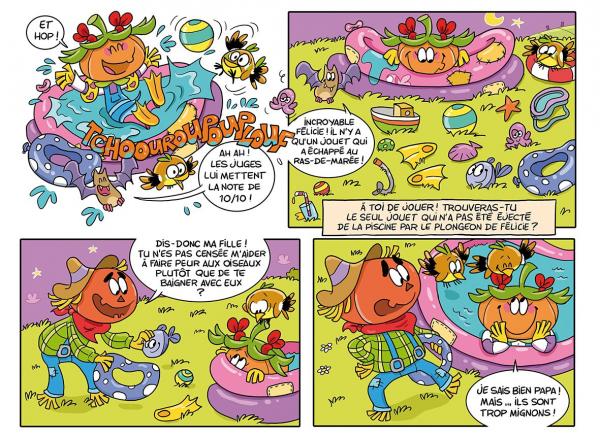 Papa épouvantail s’énerve car les oiseaux n’arrêtent pas de tourner autour de son terrain. Ce qui n’est pas un souci pour Félicie Trouille car elle adore jouer avec eux. Et elle sait qu’elle peut compter sur eux dans toutes les circonstances. Tout comme sa meilleure amie la chauve-souris, Lili. Tout le monde s’amusait bien jusqu’à l’arrivée précipitée d’une voiture. La professeure Louise Lampoule, inventrice de génie a besoin de l’aide de Félicie. Le manoir se rempli d’eau et il faut arrêter cela. La détective en herbe accepte avec la mission. Direction le manoir et des scaphandres pour explorer le site. Aventure après aventure, elles retrouvent l’ensemble des habitants qui vont l’aider dans sa quête. L’aide de chacun est importante pour la résolution de chaque énigme même celle du lecteur.