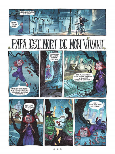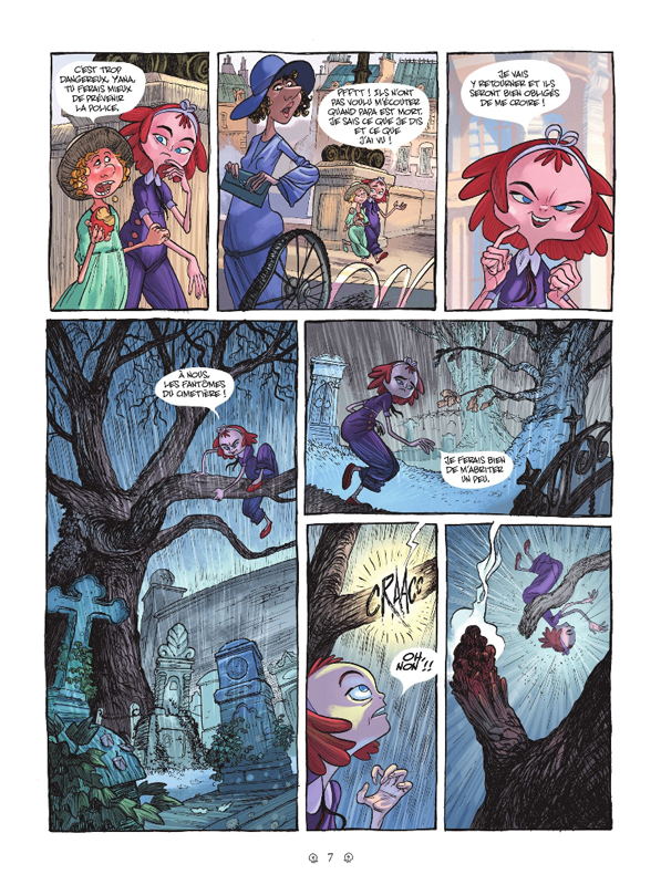 Qui a dit qu’il n’existait pas de bonnes bd jeunesse avec des énigmes, des fantômes et des gens mal-intentionnés? Ils disent cela car il n’ont pas encore rencontré Yana. Une jeune fille qui après la mort de sa mère puis de son père cherche des réponses. Cela l’a mené dans un cimetière et un rendez-vous avec la faucheuse. Ainsi toute la famille est au même niveau et en plus dans le même endroit. Une façon d’aborder la mort de façon drôle et avec du suspens. Pas de larme et pas de tristesse pour tous ceux qui ont disparu. Cette forme de fantôme permet au contraire de rencontrer d’autres personnes, de créer des liens et de faire les choses qui n’étaient pas possible de leur vivant. Une approche assez originale surtout avec une adolescente comme personnage principale. En plus, grâce à son changement d’état, elle rencontre des personnages très différents avec une samouraï, un indien, un vampire, un crâne… Une vraie équipe comme elle n’en a jamais eu avant. Donc aucun aspect macabre dans ce récit. Eric Pape trouve le parfait équilibre entre enquête policière et amitié. De son côté, Silvio Speca affirme son style graphique très particulier et très à propos. On se rapproche de l’univers de la série « Courtney Crumrin » avec le travail des nuances de noir. Même si, ici on constate des couleurs douces qui contribuent à l’étrangeté.