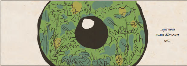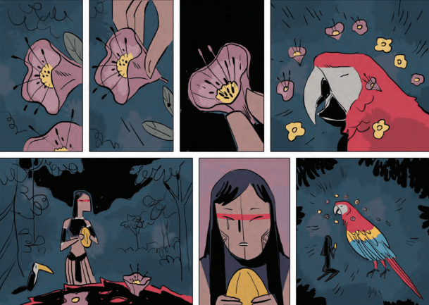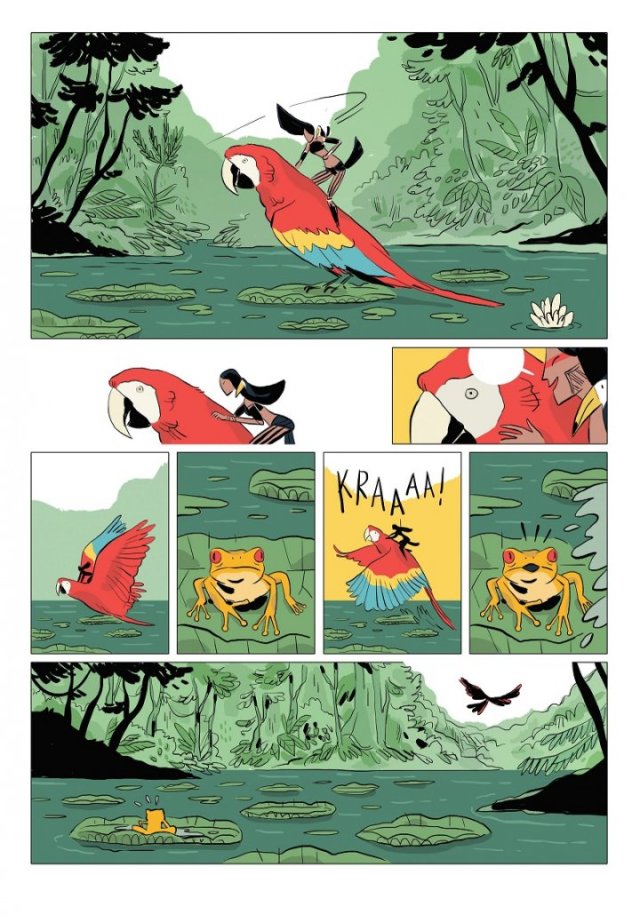 Tout débute sur du papier ancien avec une encre noire tel un authentique document. Doucement, une histoire se révèle à nous. L’oeil de ce premier découvreur prend une couleur verte et la nature se révèle. Une belle introduction à l’univers luxuriant de ce nouveau monde.