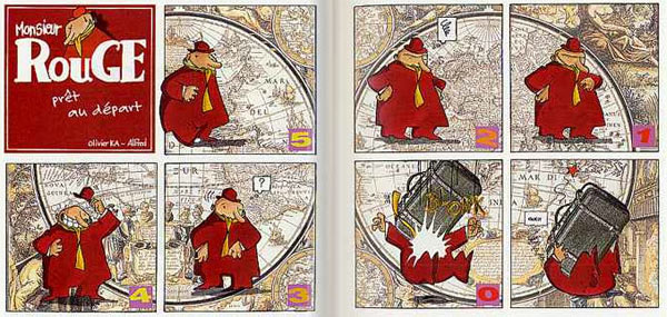 Olivier Ka et Alfred mélangent de nouveau leur savoir faire pour proposer un petit album original et fun. Une double page, 8 cases, pas de texte et la magie opère. Un personnage tout en rouge, qui bien entendu se nomme « Monsieur Rouge ». Il lui arrive sans cesse des péripéties plus absurdes et drôles les unes des autres.