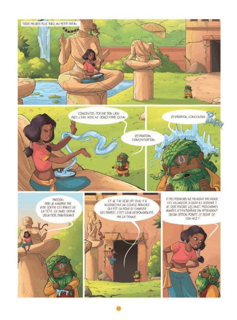 Dans la collection Miss Jungle, vous demandez de rencontre leur nouvelle héroïne : Ayati. Son talent n’est ni la danse, ni le fait de parler la langue des animaux mais elle possède en elle une magie ancestrale. Il faut beaucoup de patience et de calme afin de le maîtriser pour s’en servir au mieux. Mais ce n’est pas ce qui caractérise le mieux l’adolescente assez caractérielle qui part tambour battant pour affronter seule le mal. Nous sommes plongés au cœur d’une Inde sauvage fantasmée et fantastique. Petits chemins escarpés, nature verdoyante, animaux sauvages se développent librement aux côtés de villages. Très vite, elle trouve l’antre des méchants qu’elle va devoir affronter. Même si Fabien Fernandez trouve le bon filon dans le déroulement de son scénario pour passer des rêves au combat final. On peut lui reprocher la simplicité de l’intrigue et des rebondissements. A aucun moment, on se surprend de ce qui arrive d’autant plus quand on est une lectrice chevronnée. La frontière entre gentil et méchant est si marquée qu’elle en est peu crédible. Le graphisme de Sandra Violeau contrebalance avec ces formes rondes et les couleurs chaudes. La rétine prend le temps d’admirer l’univers riche de détail disposé un peu partout. Même si l’originalité n’est pas au rendez-vous, l’album à l’avantage de se comprendre vite et de se lire rapidement.