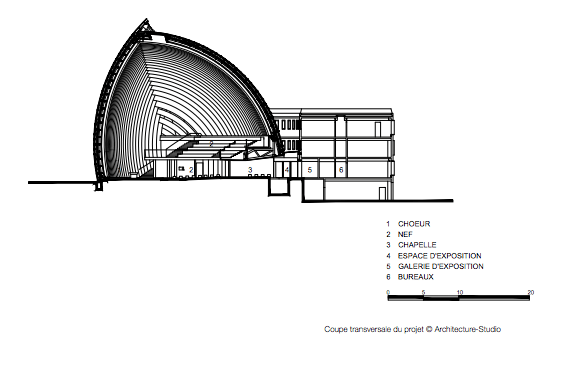 “Les arcs en bois lamellé nous ont permis de réaliser cette structure qui apparait simple, mais qui est en réalité complexe dans sa géométrie, car chaque arc est, en quelques sortes, un prototype… Du fait de l’axe de symétrie, il n’y a en effet que deux arcs semblables. Si on résume l’ensemble des contraintes conceptuelles et géométriques, les arcs en bois lamellé se sont révélés être la meilleure solution pour cette magnifique cathédrale.”