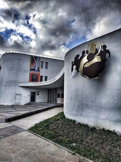 Dans le coin, il ni avait pas d’église. L’évêché a décidé en 1971 d’en faire construire une mais de façon enterrée respectant la Pastorale de l’enfouissement. Une manière de faire à l’époque afin de rester discret et de ne pas faire du prosélytisme ostentatoire. Puis l’état d’esprit a changé et il fallait voir plus grand. L’église inaugurée le 18 juin 1976 consacrée en cathédrale le 24 avril 1987 passe trop inaperçue au goût du pouvoir religieux. La première cathédrale dessinée par l’architecte Charles-Gustave Stoskopf, lauréat du Prix de Rome, reprend en partie les bases de l’église sans pourtant en conserver aucune trace. Puis c’est au tour de la première cathédrale d’être détruite en 2013. La nef et les deux narthex ont été démolis seules les fondations ont été reprises.