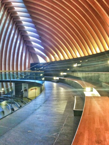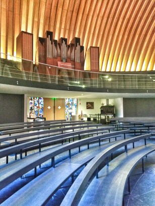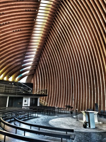Le sol incurvé est en forme de poisson ou demi-cercle soit disant en référence à un texte biblique selon un guide bénévole de la cathédrale. Mais je n’ai pas trouvé de données sur les différents sites d’architectures corroborant ce fait. Peut-être est-ce une vision de croyant pratiquant.