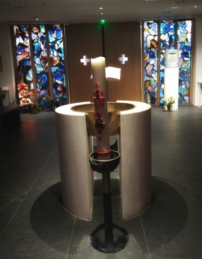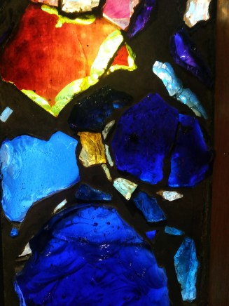 Les deux vitraux qui illuminent par derrière cet espace proviennent de l’ancienne cathédrale.