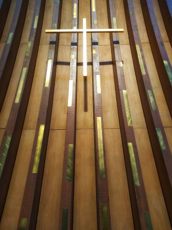 La croix en bois doré, signalée par une composition de plaques de laiton réalisées par les plasticiens scénographes Stéphane Durand et Véronique Folhen. Les petits rectangles autour symbolise le buisson ardent.