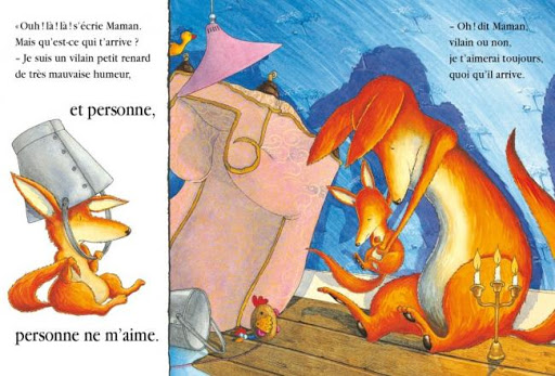 Petit Renard est de très mauvaise humeur alors il fait plein de bêtises dans la maison. Maman Renard vient le voir et lui doucement de s’expliquer. Il répond : « Je suis un vilain petit renard de très mauvaise humeur, et personne, personne ne n’aime ». Il n’en fallait pas plus pour faire un calin. La mère doucement le rassure. Petit Renard lui demande si elle l’aimerait même c’était un ours, une mouche, un hanneton, un crocodile… Bien entendu qu’elle l’aimerait sans condition. Ces douces paroles le rassure et lui redonne le sourire. Un grand moment de partage qui confirme l’amour réciproque.